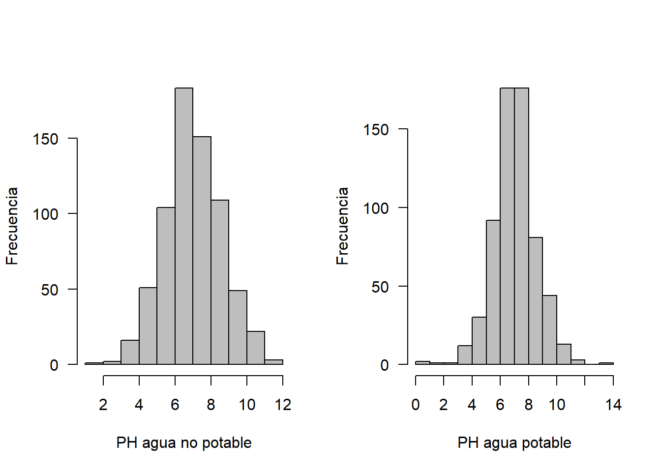 hist(no, xlab = "PH agua no potable", ylab = "Frecuencia", las=1, main = "", col = "gray")