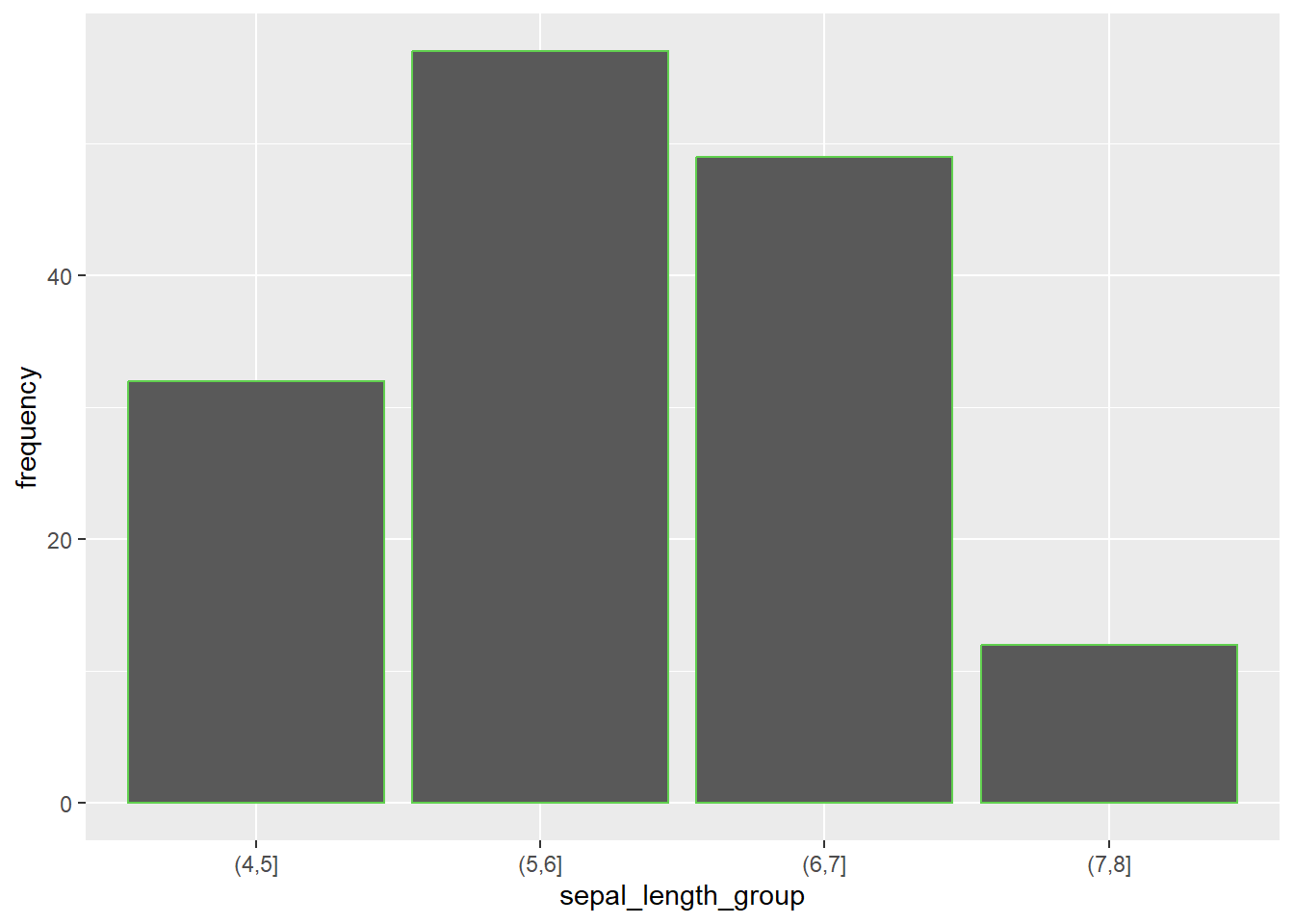 geom_bar(aes(x = sepal_length_group, y = frequency), stat = 'identity',col=3)