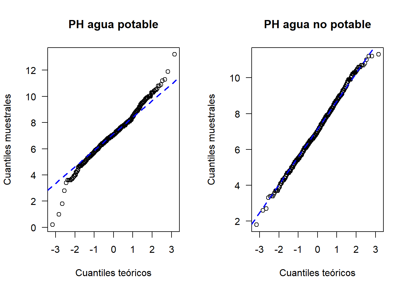 qqnorm(y=si, main='PH agua potable', ylab='Cuantiles muestrales',